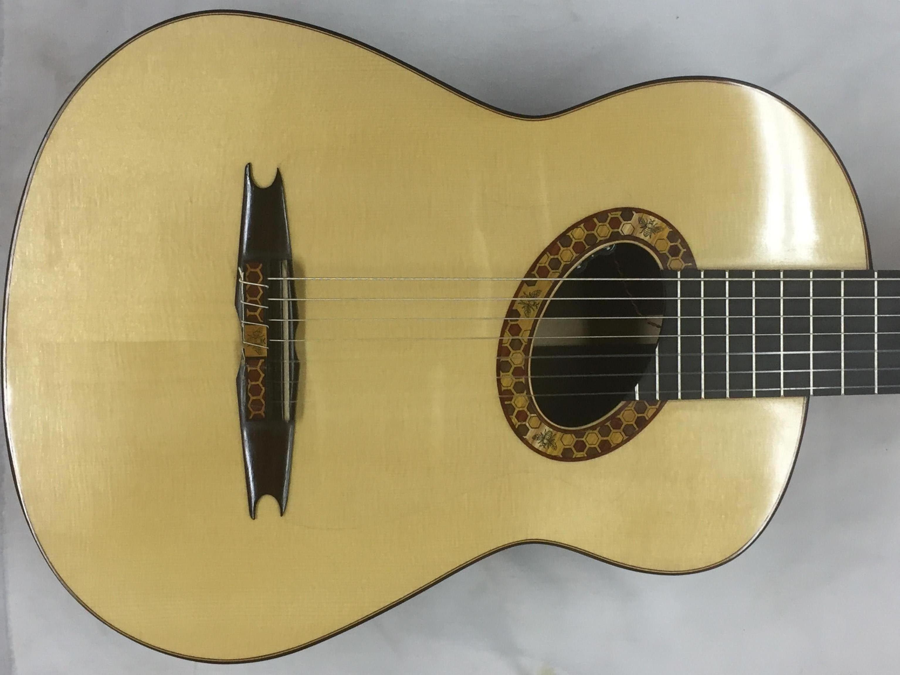 Lauras guitar has an inverted Torres strutting a little like Yacopi but with a slanted lower harmonic bar and a thin top. It also has a special bridge design although I now make the bridges differently, much smaller and lighter which helps increase the volume and makes for a fast attack.