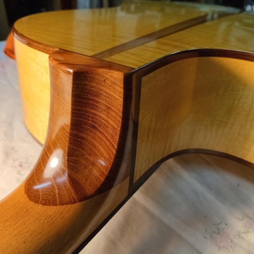 This guitar was born out of a special comission from my friend and duo partner Laura Dos Santos. She was wanting to start playing a a 7 string guitar, she had some ideas of what she would like so we added some design features to make the guitar more ergonomical, the asymetrical shape along with the angled oval soundhole naturally gave the guitar 2 extra frets without needing an extension.